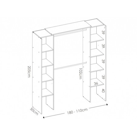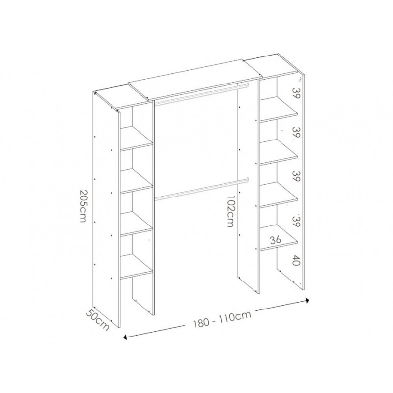 Dressing extensible : Grâce à sa barre de penderie recoupable, ce dressing est extensible. Pour ajuster la longueur, il vous suffit simplement de couper la barre de penderie à la longueur souhaitée.