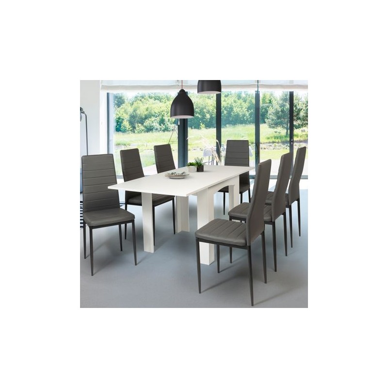 Un véritable confort au quotidien ! Vous avez vu grand, recevez du monde de façon impromptue ou organisez un repas de famille? Pas besoin de deuxième table.Grâce à son système ingénieux de rallonges pliables à la façon d'un portefeuille, transformez-là en un instant!Avec ses dimensions généreuses une fois dépliées 160 x 78 cm et son format rectangulaire, installez jusqu'à 6-8 couverts selon vos assises pour des repas mémorables !Son design contemporain et épuré, mélange de lignes droites et arrondies, ainsi que son coloris blanc chic et moderne, apporteront de la luminosité à votre intérieur.En plus d'être fonctionnelle, les courbes arrondies du piétement assurent d'être confortablement installé.Stable et robuste, en panneaux de particules, dotée de pieds d'une largeur de 11 cm, ne craignez pas d'y poser votre vaisselle, vos vases et plats ...Grâce à ses dimensions pratiques même un fois repliée, Longueur 80 cm x largeur 78 cm, en véritable caméléon, servez-vous en comme bureau d'appoint selon vos besoins du moment. Largement suffisant pour y disposer livres, papiers, ordinateur!Un table multi fonctions design parfaite pour tous les jours et les grandes occasions !Dimensions de la table à manger DONA pliable/extensible :Dimensions totales pliée : Longueur 80 cm x largeur 78 cm x Hauteur 76 cmDimensions totales dépliée : Longueur 160 cm x largeur 78 cm x Hauteur 74 cmDimensions des pieds : Longueur 11 cm x largeur 11 cm Solide, elle est surélevée de 4 pieds en bois Plateau épaisseur 2 cmRetrouvez tous nos coloris et modèles contemporains sur notre boutique en ligne :Collection DONA